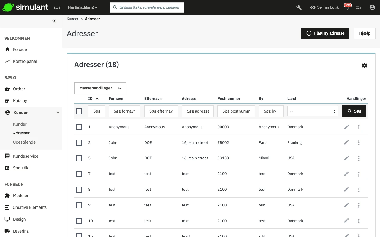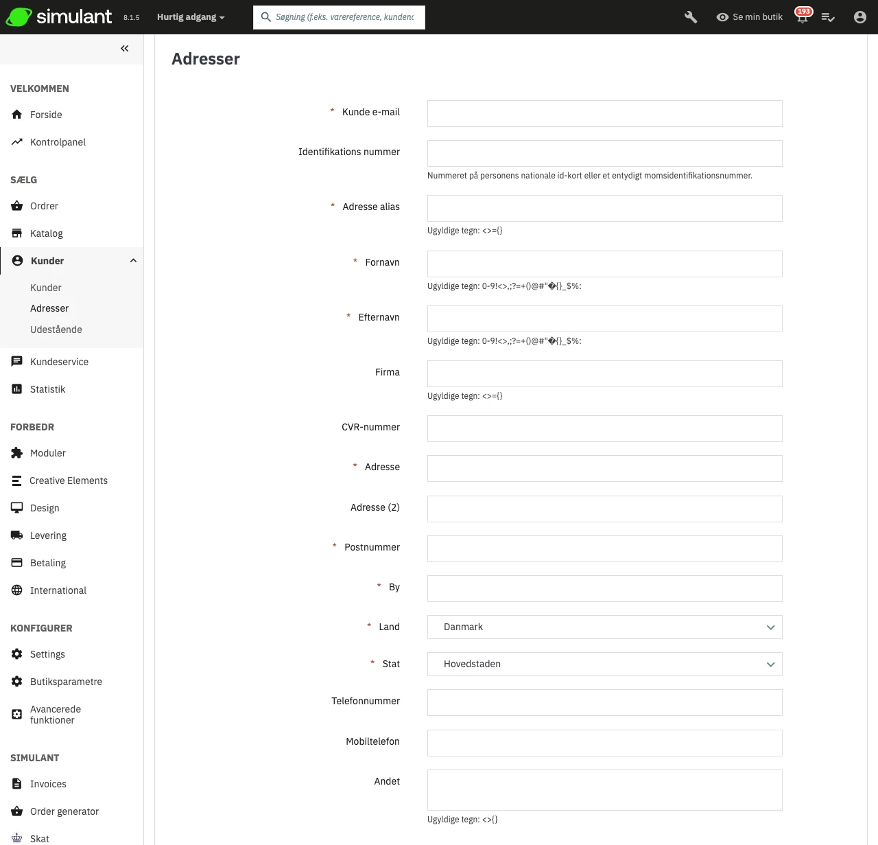 - Kundens e-mail. Dette felt er essentielt: Hvis du tilføjer en adresse for en eksisterende kunde, skal du identificere kunden med hendes/hans e-mailadresse. Ellers vil Simulant ikke vide, hvilken kunde adressen skal tildeles.