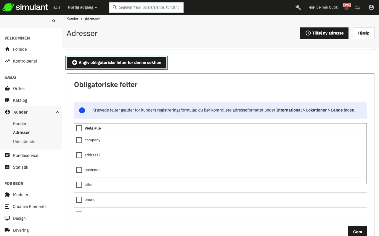 Nedenfor adrestabellen findes knappen "Angiv obligatoriske felter for denne sektion". Den åbner en formular, hvor du kan angive, om et databasefelt er nødvendigt eller ej ved at markere de relevante felter: På denne måde kan du f.eks. gøre felter som "firma" eller "telefonnummer" obligatoriske, når en kunde registrerer en ny adresse i butikken.