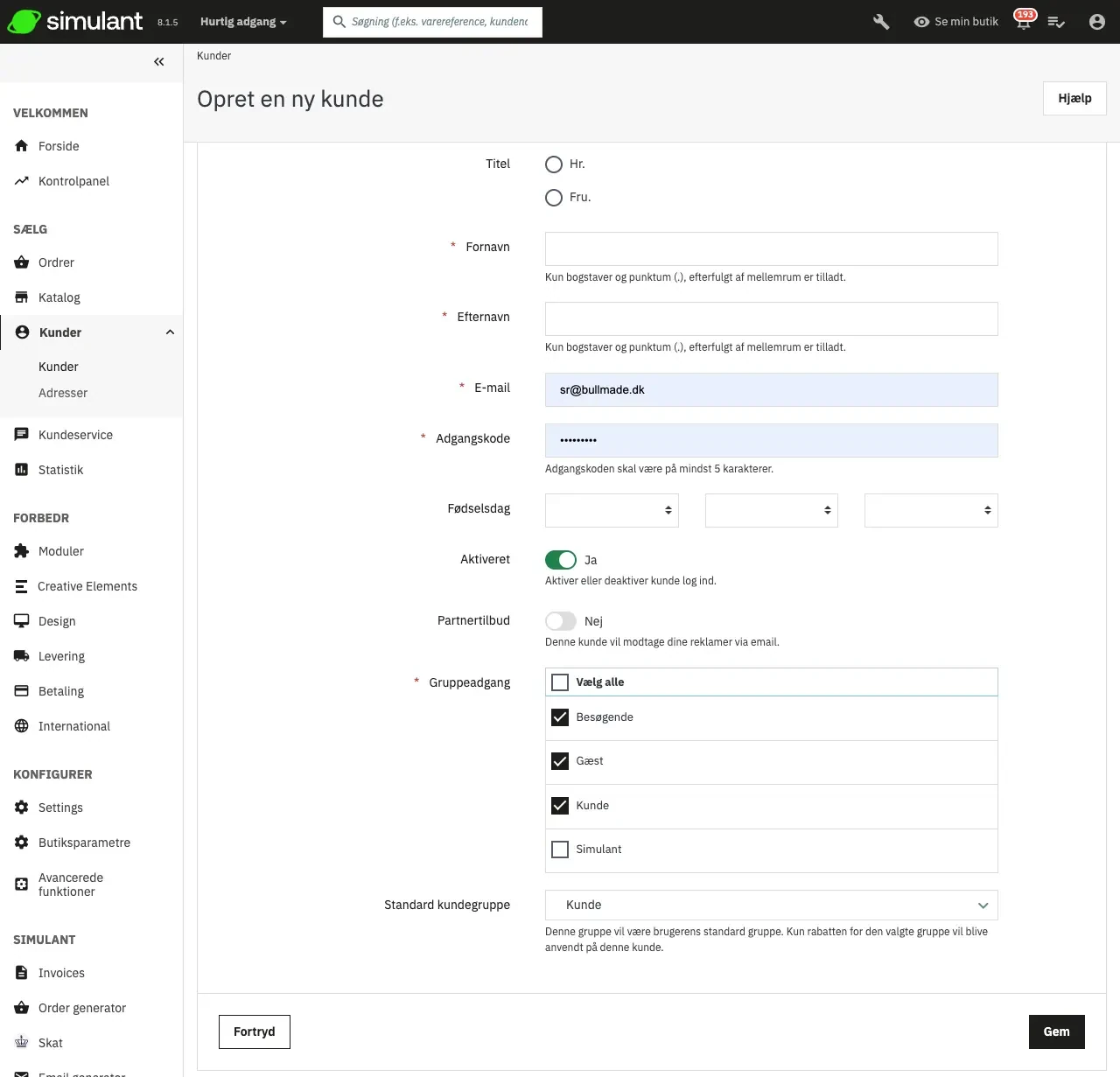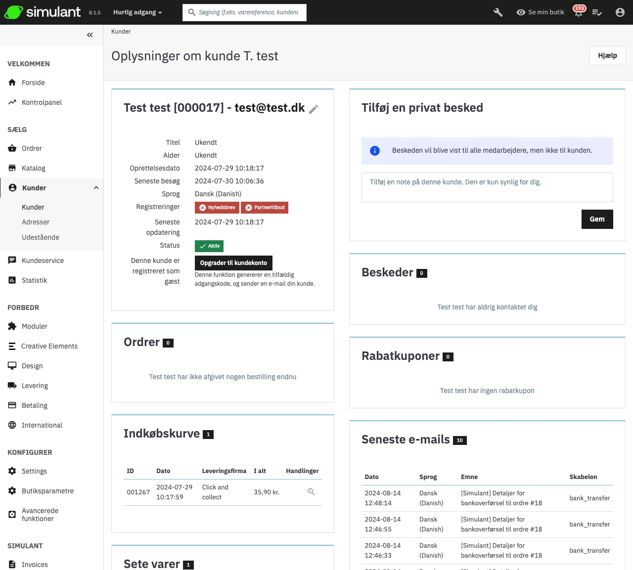 Du kan bruge denne fiktive bruger til at teste nogle af butikkens funktioner og se butikken, som en almindelig bruger ville.