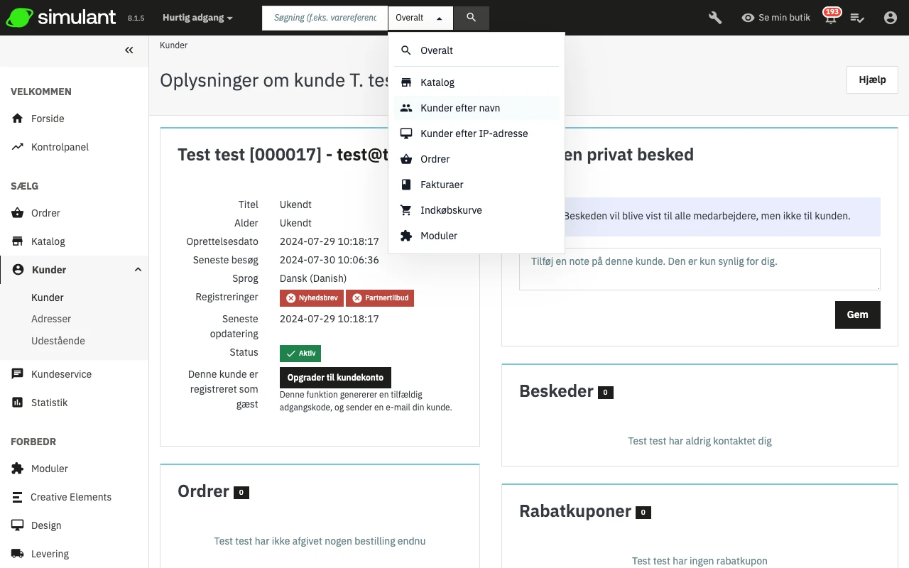 Den anden metode består i at gå til siden "Kunder" og vise alle kunder.
