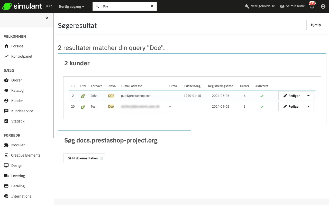 Den første side under menuen "Kunder" giver dig en liste over alle de registrerede brugere på butikken.