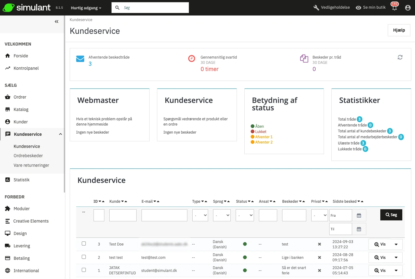 I praksis præsenterer kontaktformularen på butikken, som er tilgængelig under linket "Kontakt os" i bunden, kunden med to kontakter som standard: "Kundeservice" og "Webmaster". Kunden skal blot vælge, hvem de vil kontakte, og derefter udfylde resten af felterne. Beskeden bliver derefter registreret i Simulant kundeservicetool.