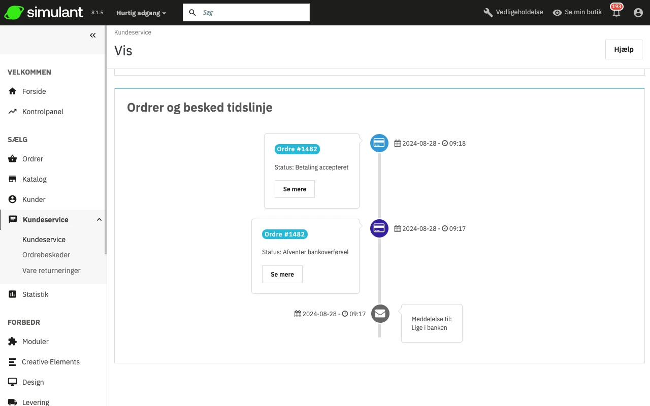 Nederst på siden giver "Ordre- og beskedoversigt" dig en klar kronologisk visning af hændelserne i denne diskussionstråd. Når det er knyttet til en ordre, vil du også have ordredetaljerne.