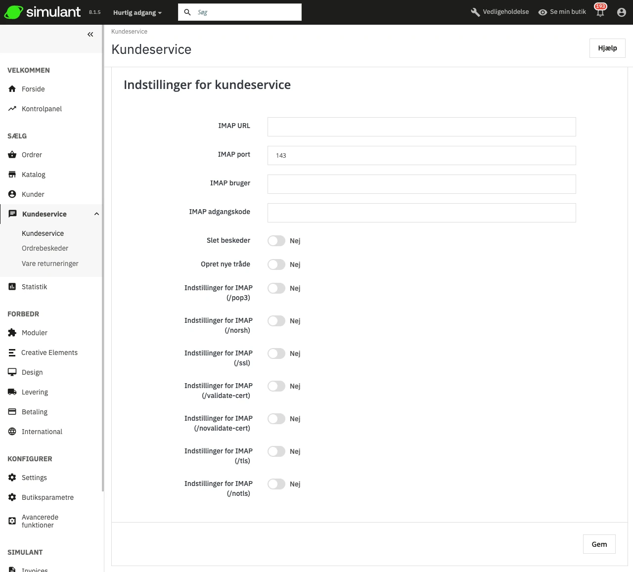 Du skal også korrekt konfigurere IMAP-indstillinger, så Simulant kan hente kundernes svar på e-mails sendt fra kundeservicetoollet. Dette gøres i sektionen "Kundeserviceindstillinger" nederst på skærmen.