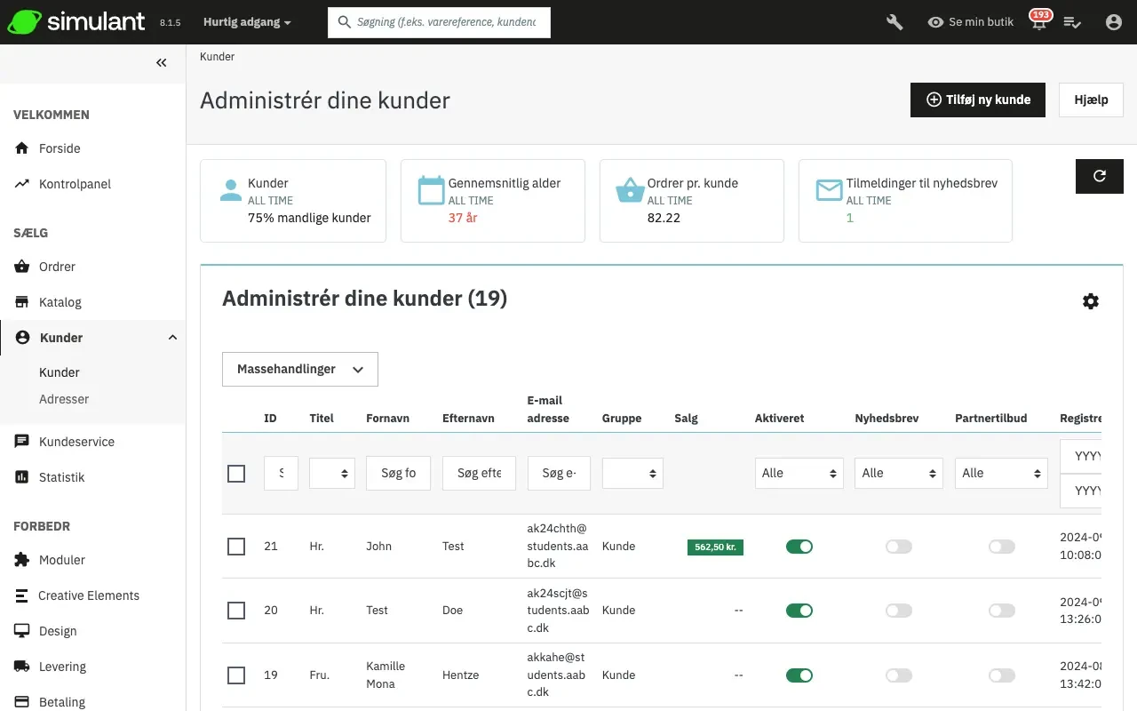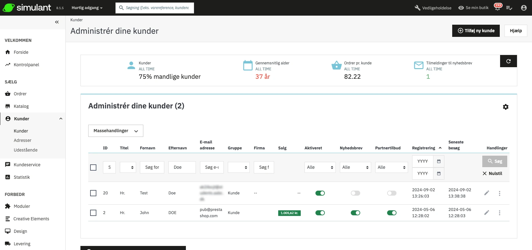 Den første side under menuen "Kunder" giver dig en liste over alle de registrerede brugere på butikken.